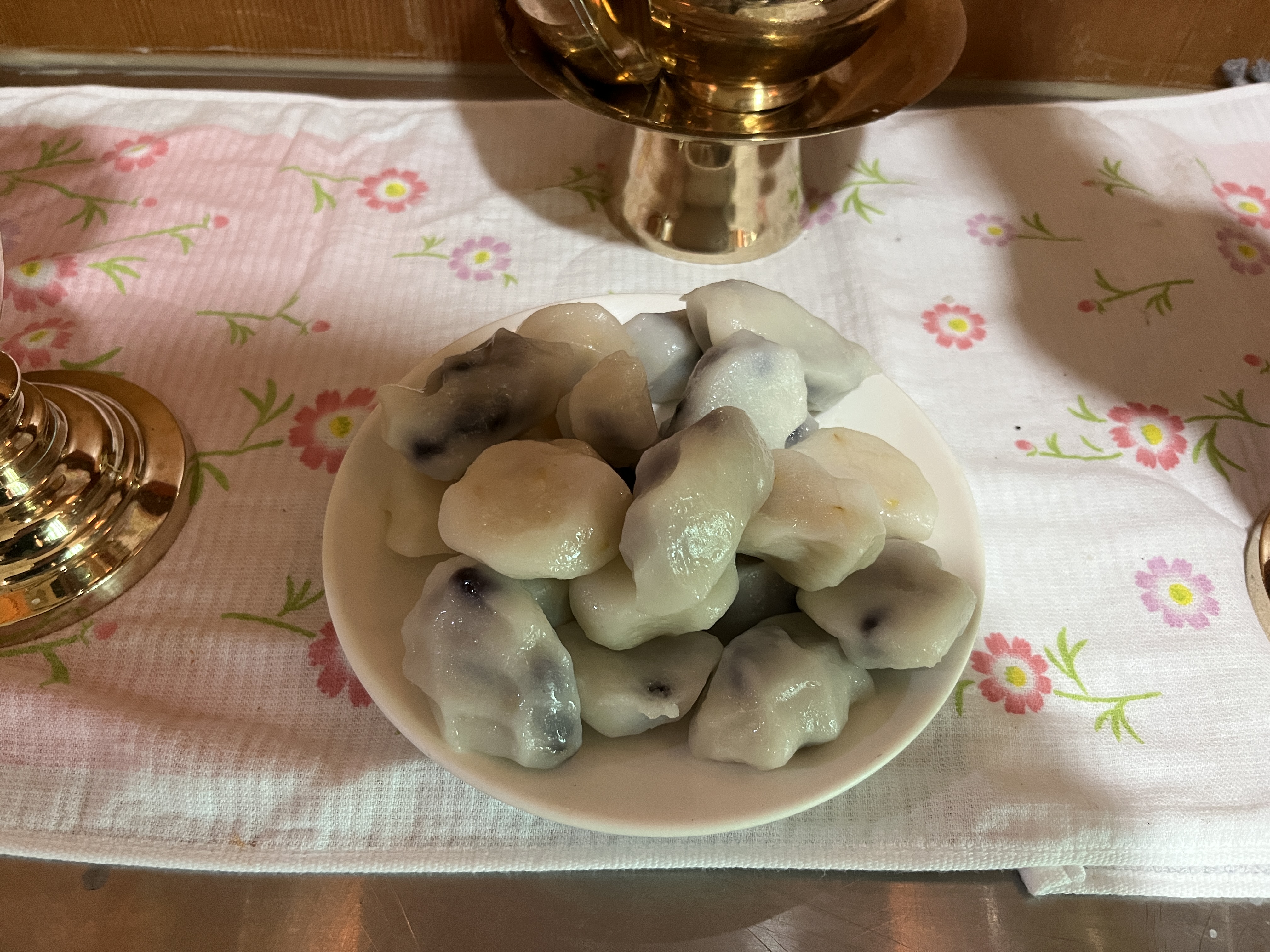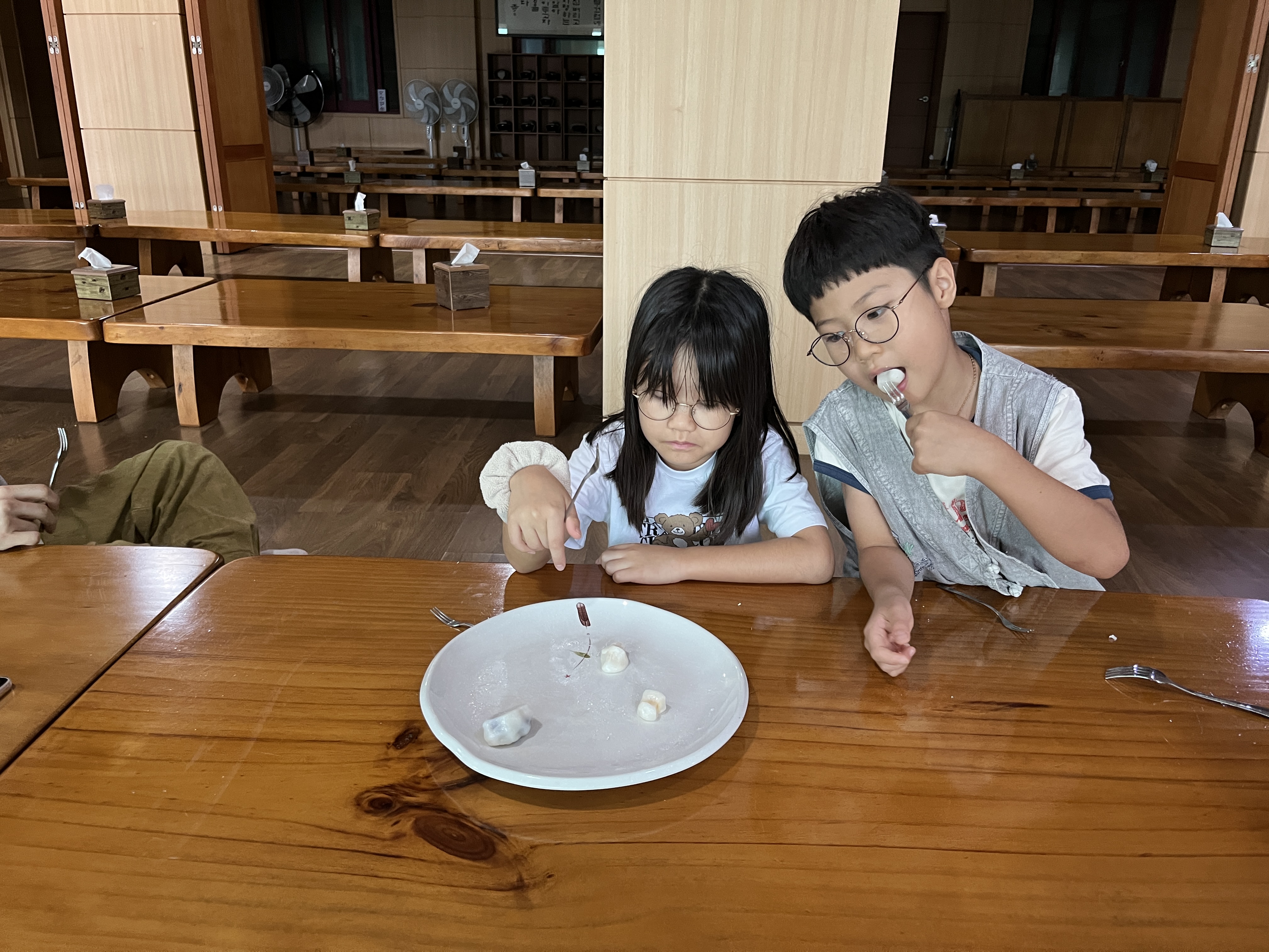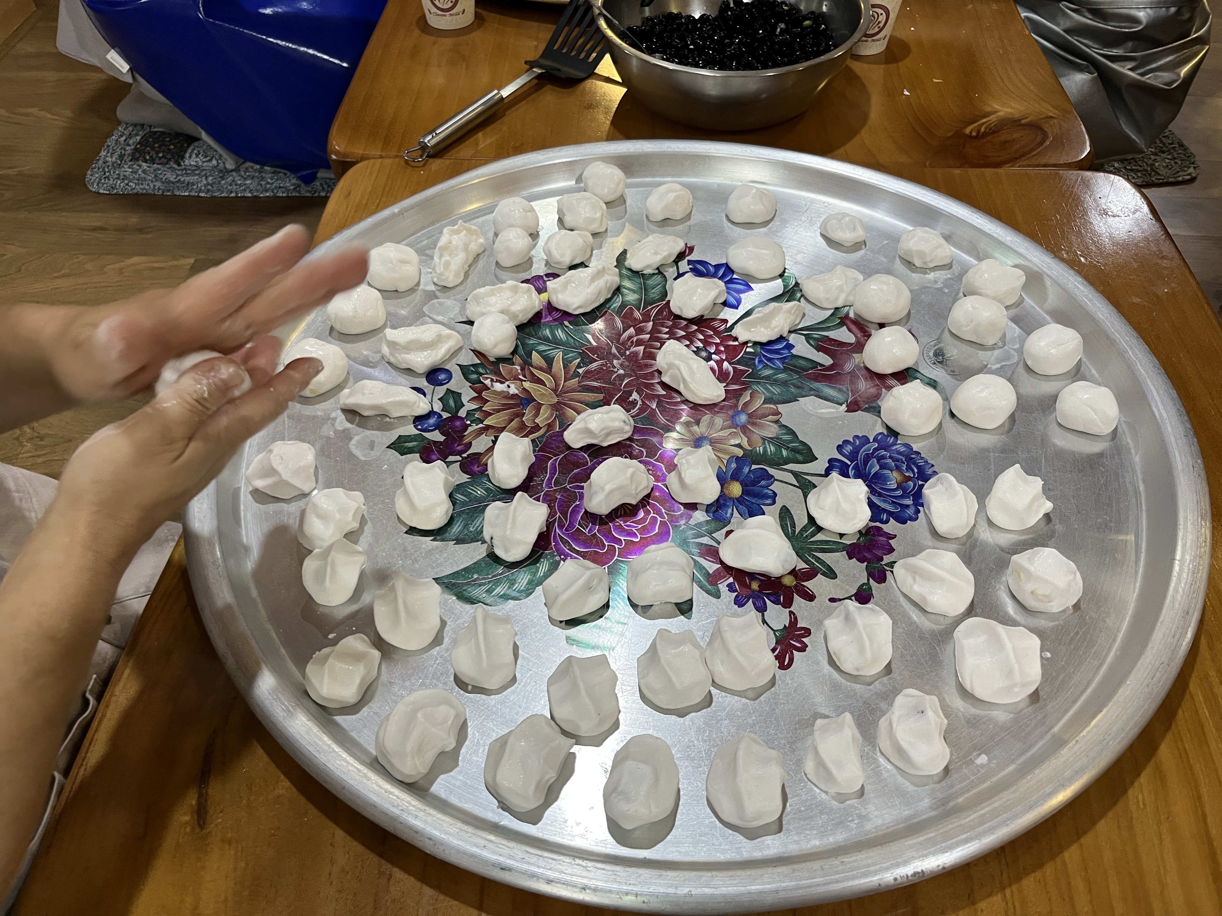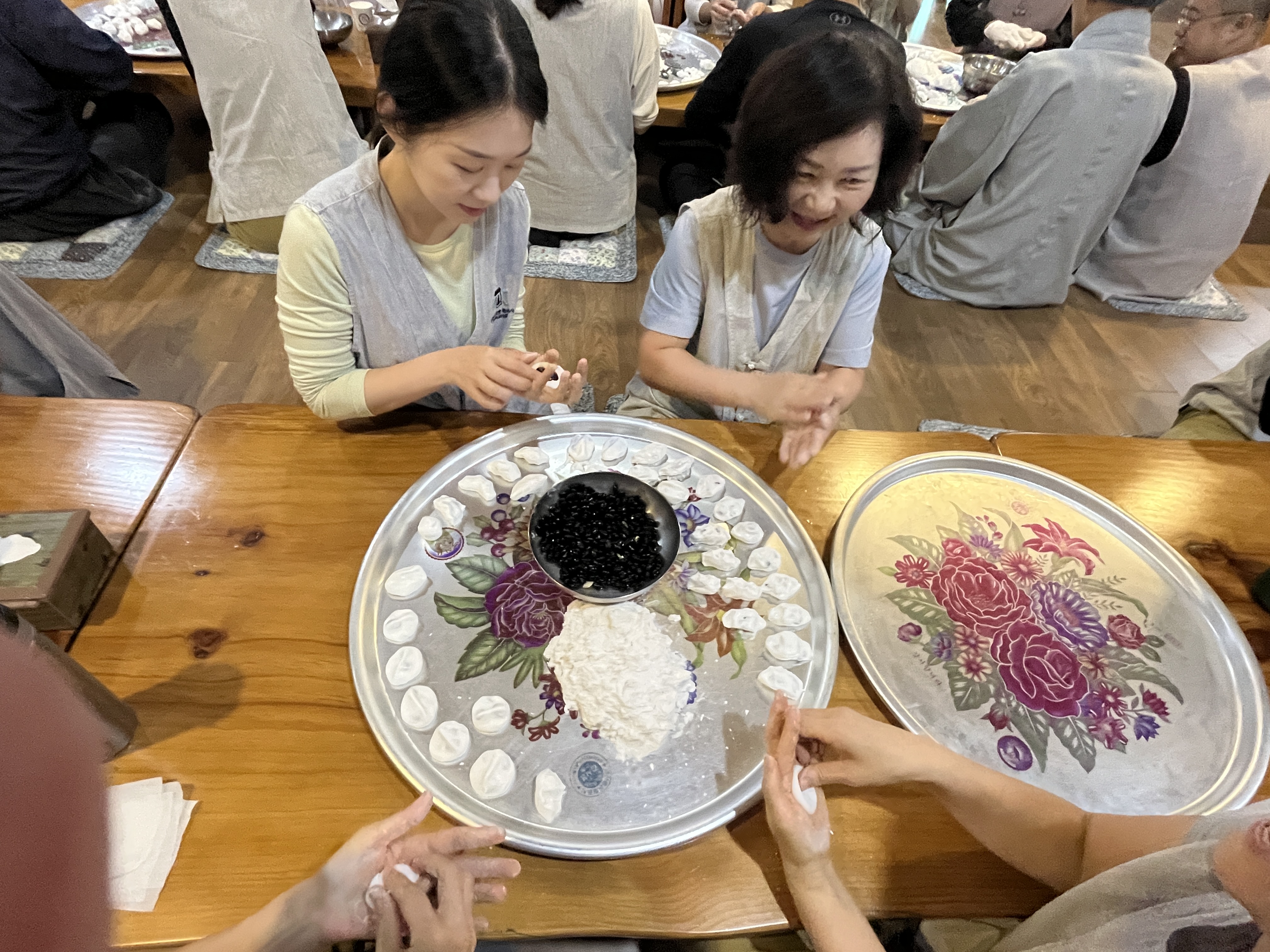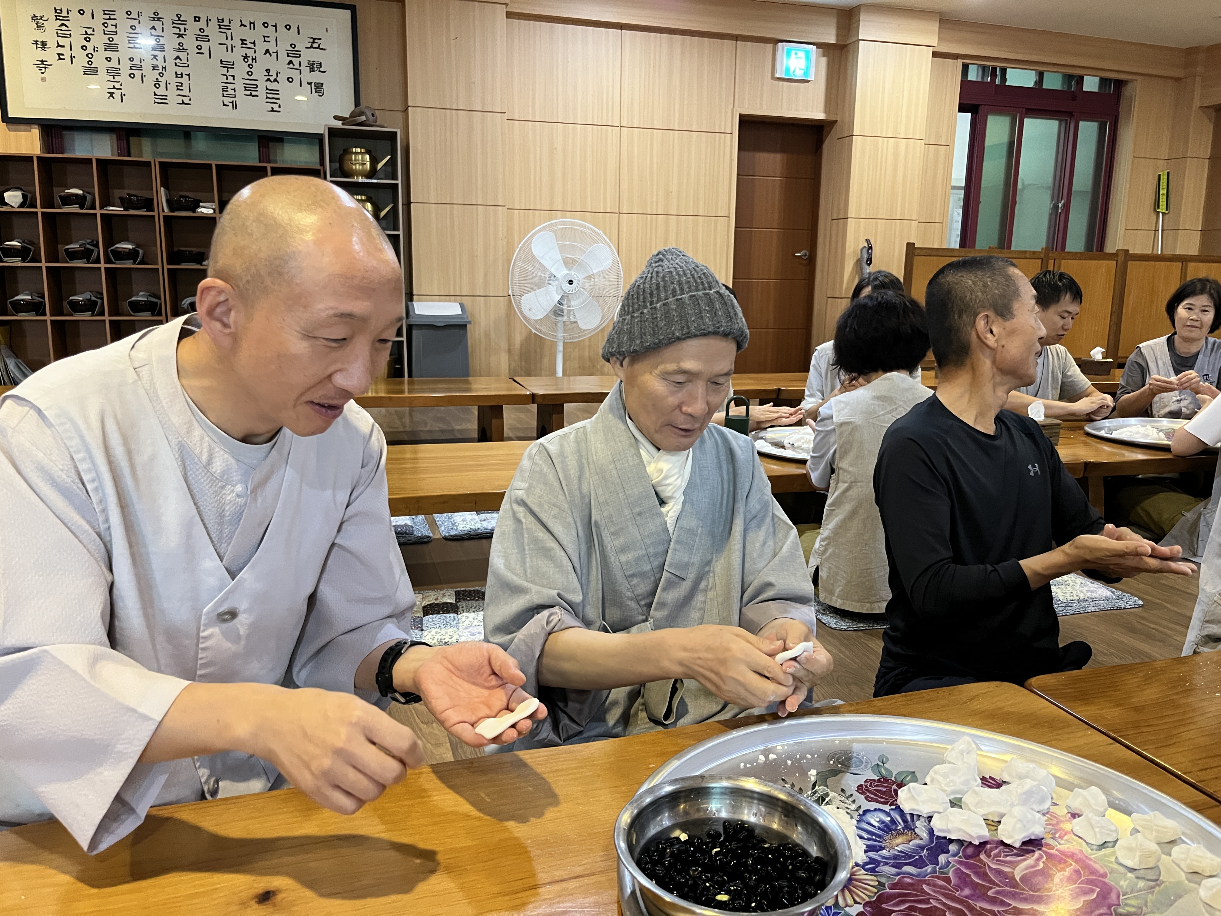 이른 아침(8시)에 공양간에 모여 누가 누가 송편 잘 빚나 경쟁을 하는 듯싶습니다.
